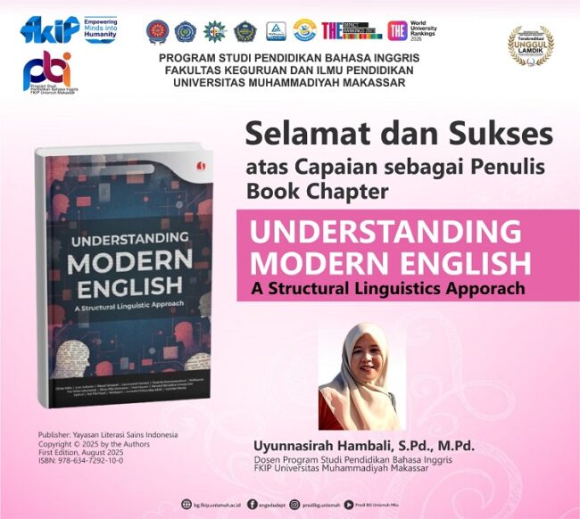 MAKASSAR – Civitas akademika Universitas Muhammadiyah (Unismuh) Makassar kembali menorehkan prestasi membanggakan di kancah nasional. Uyunnasirah Hambali, S.Pd., M.Pd, salah satu dosen produktif dari Program Studi Pendidikan Bahasa Inggris Fakultas Keguruan dan Ilmu Pendidikan (FKIP), sukses menjadi bagian dari tim penulis buku akademik terbaru bertajuk “UNDERSTANDING MODERN ENGLISH (A Structural Linguistic Approach)”. Buku yang diterbitkan…